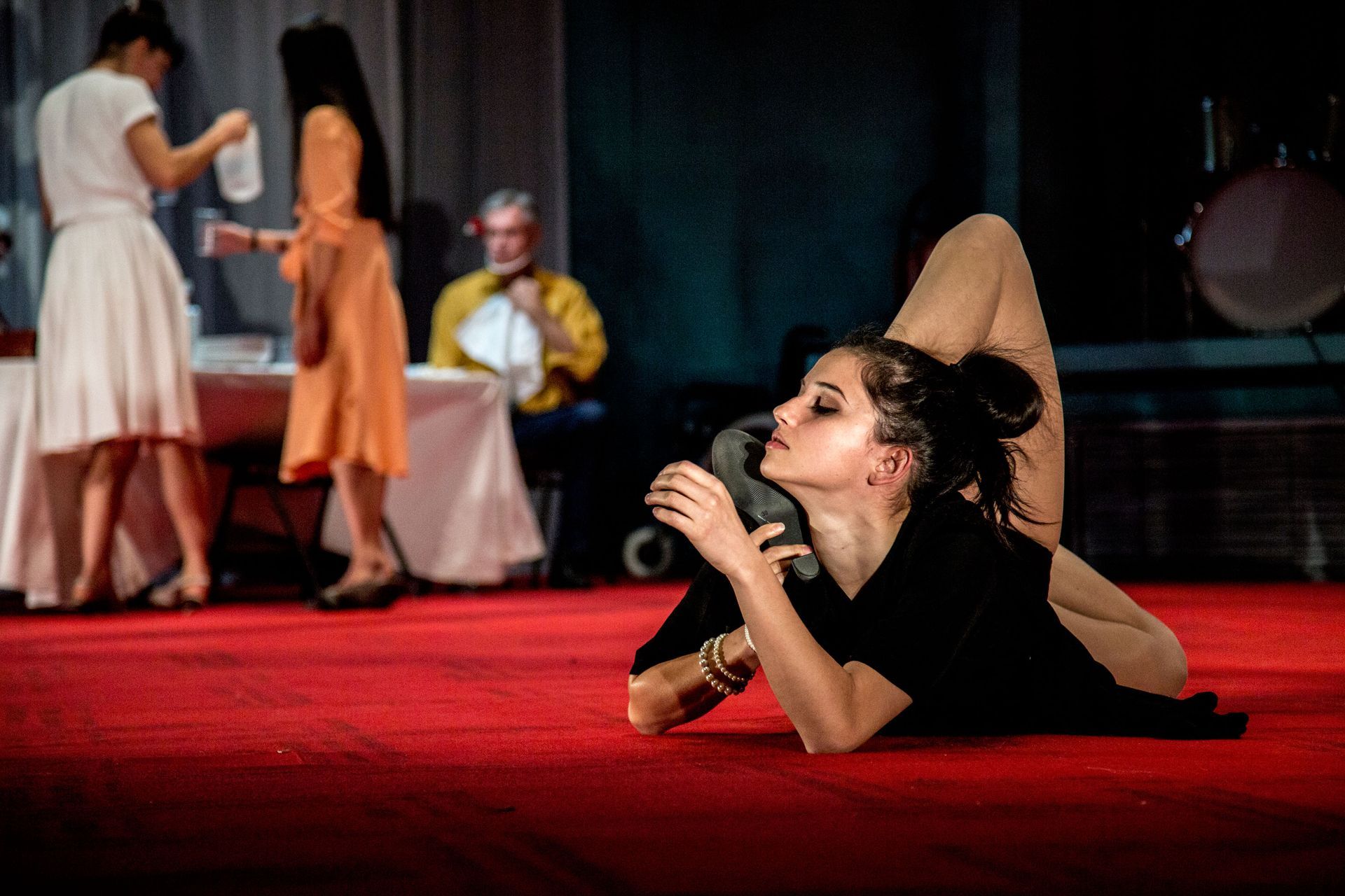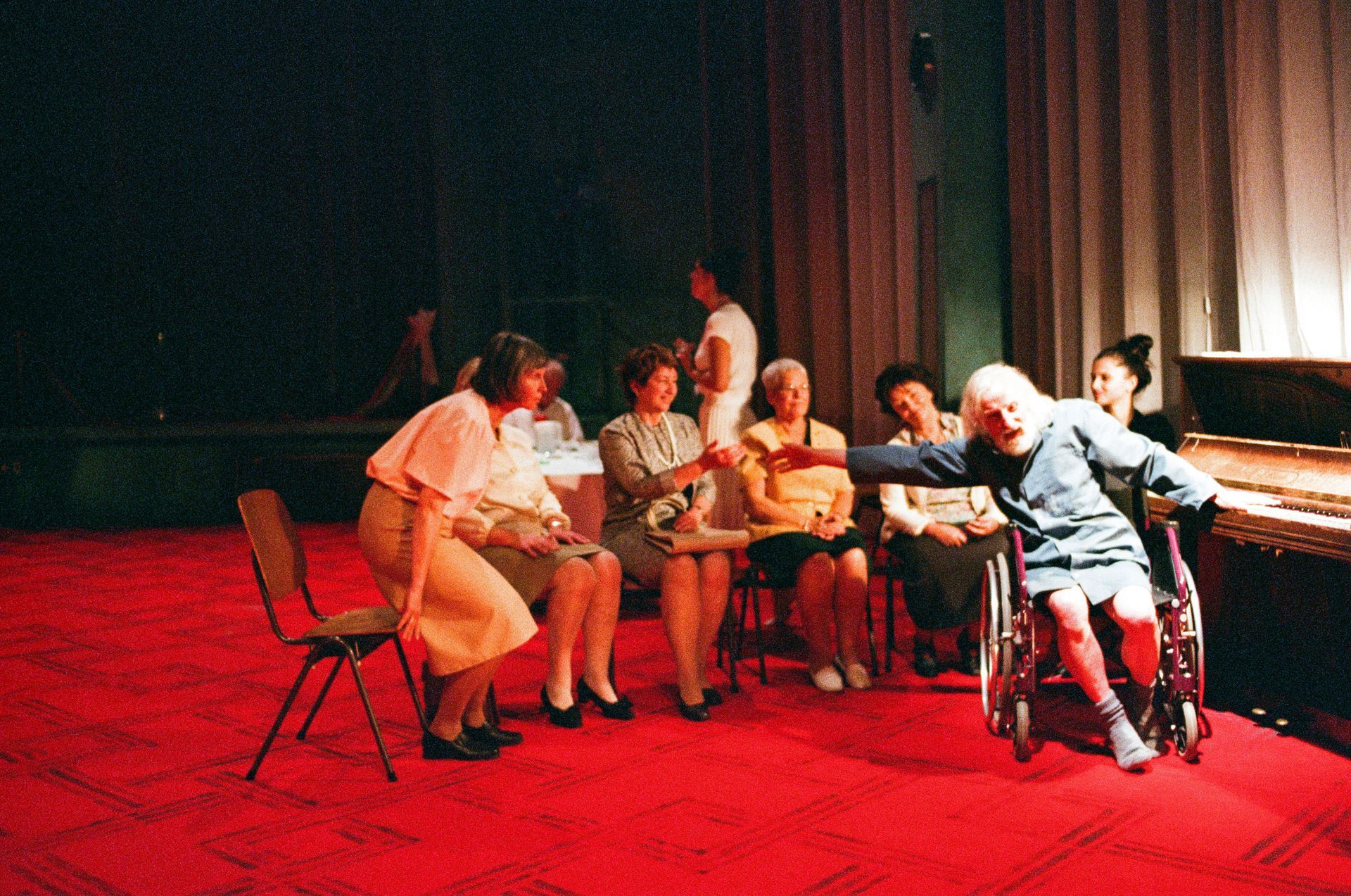 Vader , een regie van Franck Chartier, speelt zich af in de recreatieruimte van een bejaardentehuis, waarbij de torenhoge muren aangeven dat we ons diep onder de grond bevinden. Centraal in dit “voorgeborchte” – ergens tussen het rijk van de levenden en dat van de doden in – vinden we de figuur van de vader, een man die zich geleidelijk aan afschermt van de gemeenschap. Zijn “vervagen” is niet zozeer het verhaal van een individu, als wel dat van de mythologische figuur die de vader is.